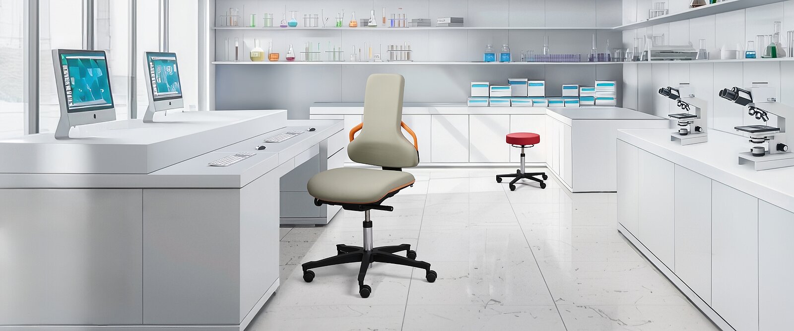Perfección en el detalle. Para poder concentrarse y trabajar con precisión se requiere una postura relajada. Al trabajar con el microscopio, por ejemplo para registrar los resultados de una investigación, la silla del laboratorio debe ofrecer una postura ergonómica, así como adaptarse a la postura de la persona sirviéndose de una tecnología inteligente. Después de todo, en las profesiones con un gran nivel de responsabilidad, el confort del asiento y el rendimiento están estrechamente relacionados.